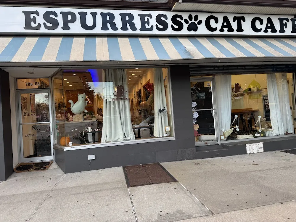 Espurresso Cat Cafe 有「意式」猫咖 is a premier cat cafe in Queens located in the Bayside neighborhood. This unique destination combines a passion for specialty-grade coffee with a mission to help rescue cats find their forever homes. In partnership with Purrific Homes, the cafe serves as a feline sanctuary for more than ten adoptable cats, including charismatic residents like Patrick, Asher, and Bob. Guests can book hourly sessions in the cozy cat lounge to play, cuddle, and relax with these furry companions in a stress-free environment. The cafe proudly serves over fifteen specialty coffee blends from For Five Coffee, along with a curated menu of handcrafted teas, pastries, and snacks. Since walk-in space is limited, making a reservation is highly recommended to secure your time in the lounge. It is the perfect spot for cat interaction, community connection, or hosting private events.